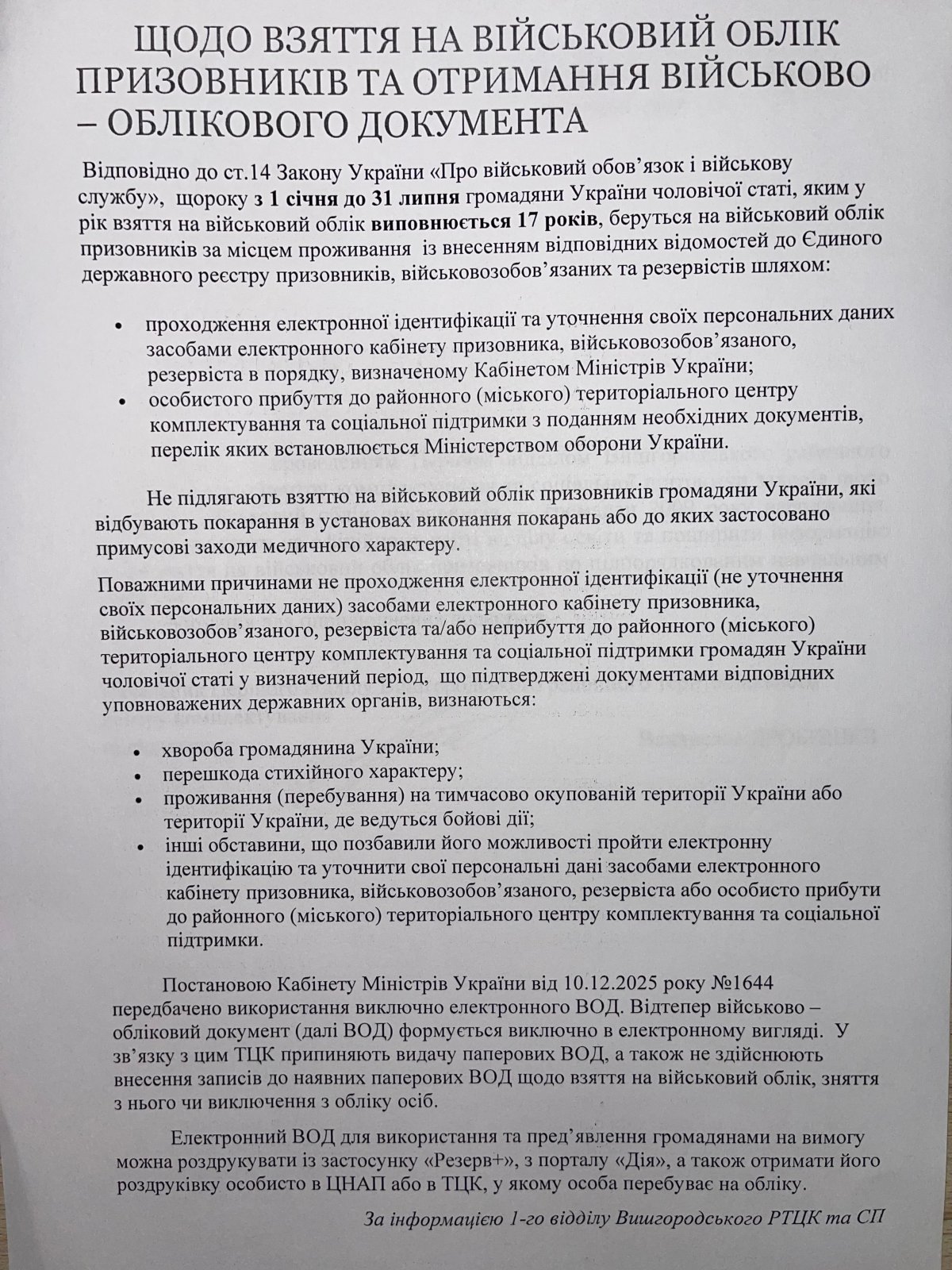 Щодо взяття на військовий облік призовників та отримання військово-облікового документа